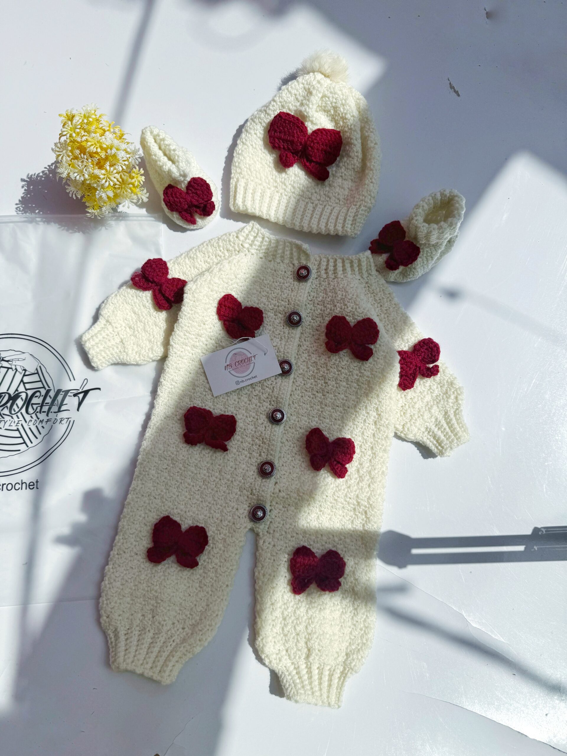 Delicately crafted in soft cream yarn and adorned with charming red bows, this cozy romper comes with a matching hat and booties. Perfect for keeping your little one warm in style. 🌸🎀