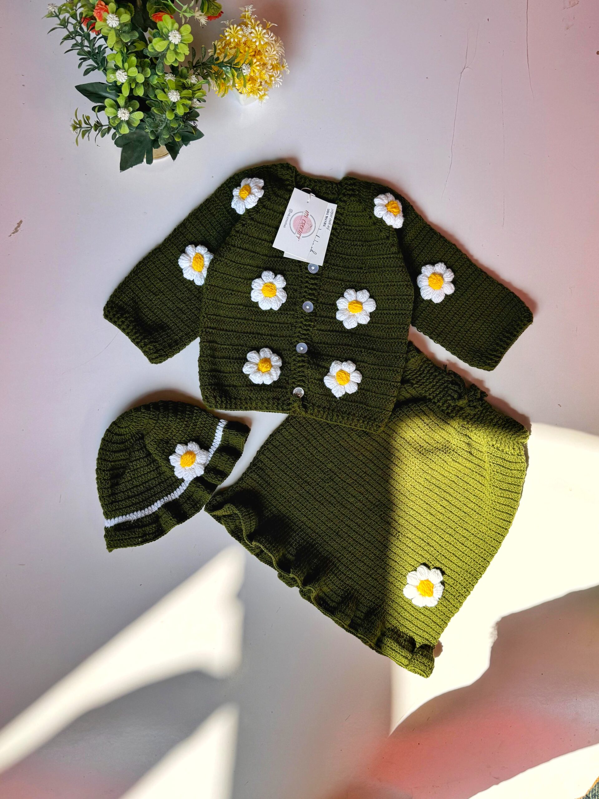 Charming three-piece crochet outfit featuring a cozy button-up sweater, matching ruffled skirt, and adorable hat — all in rich olive green with cheerful white-and-yellow daisy appliqués.
