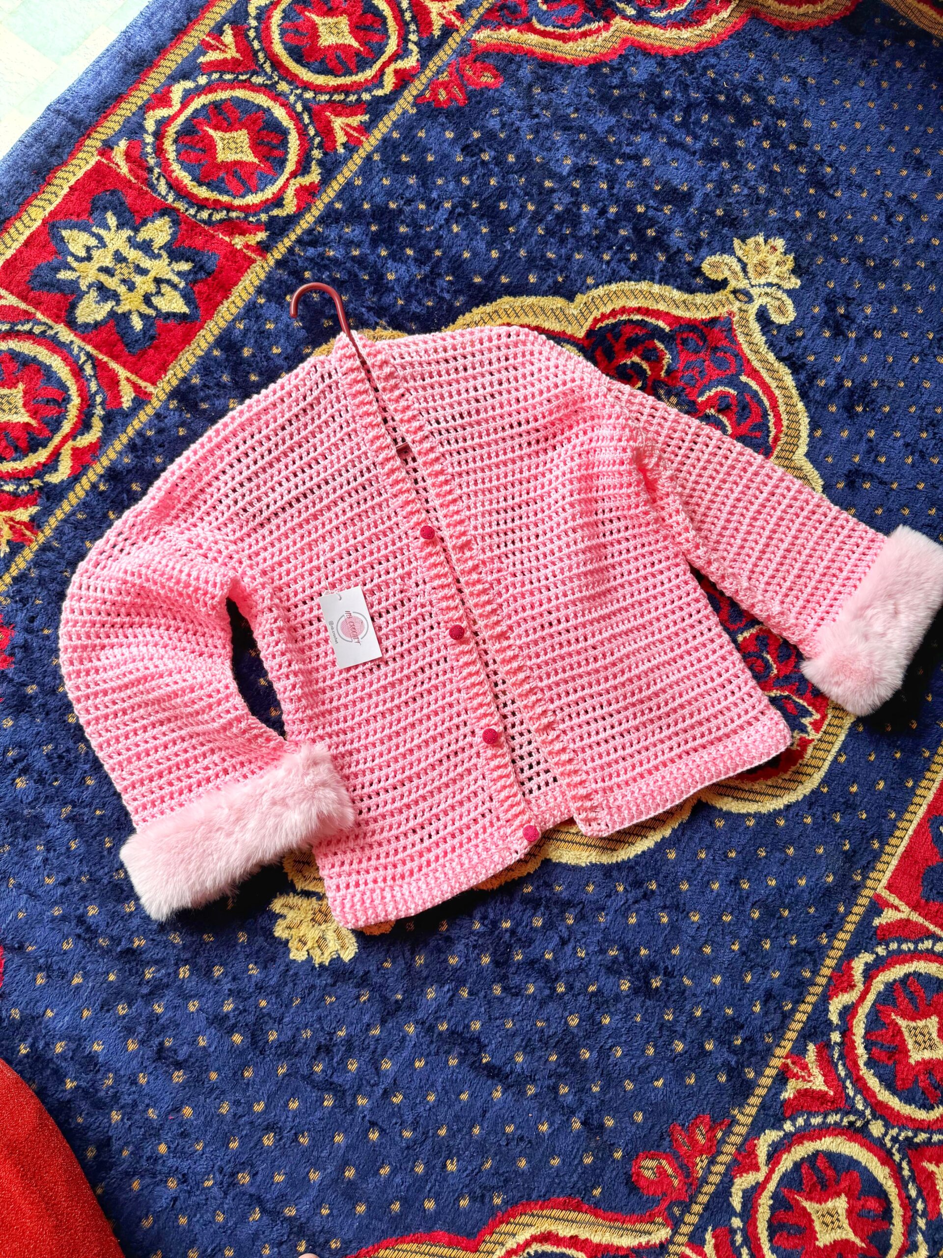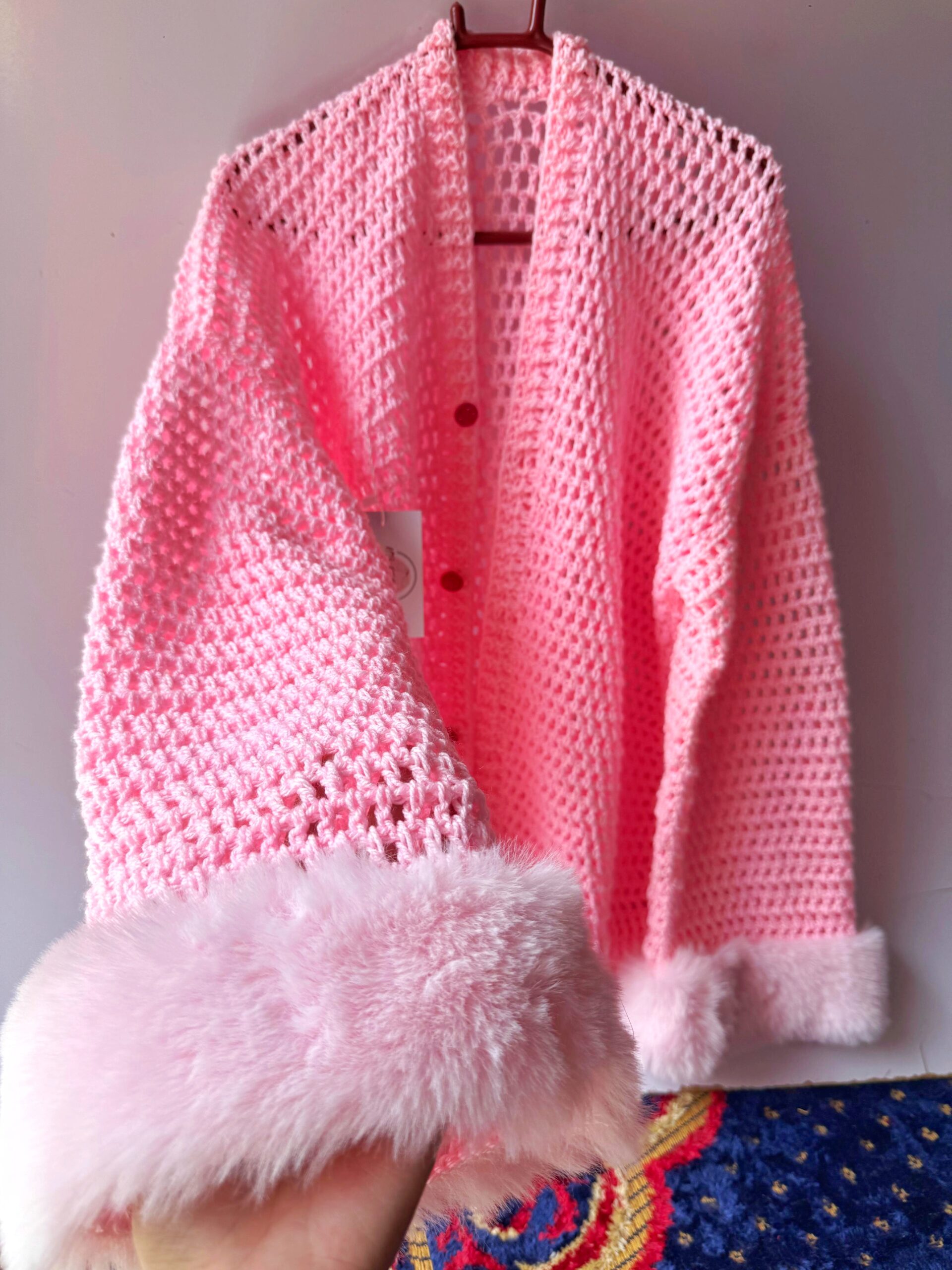 Hand-crocheted design in soft pink yarn
