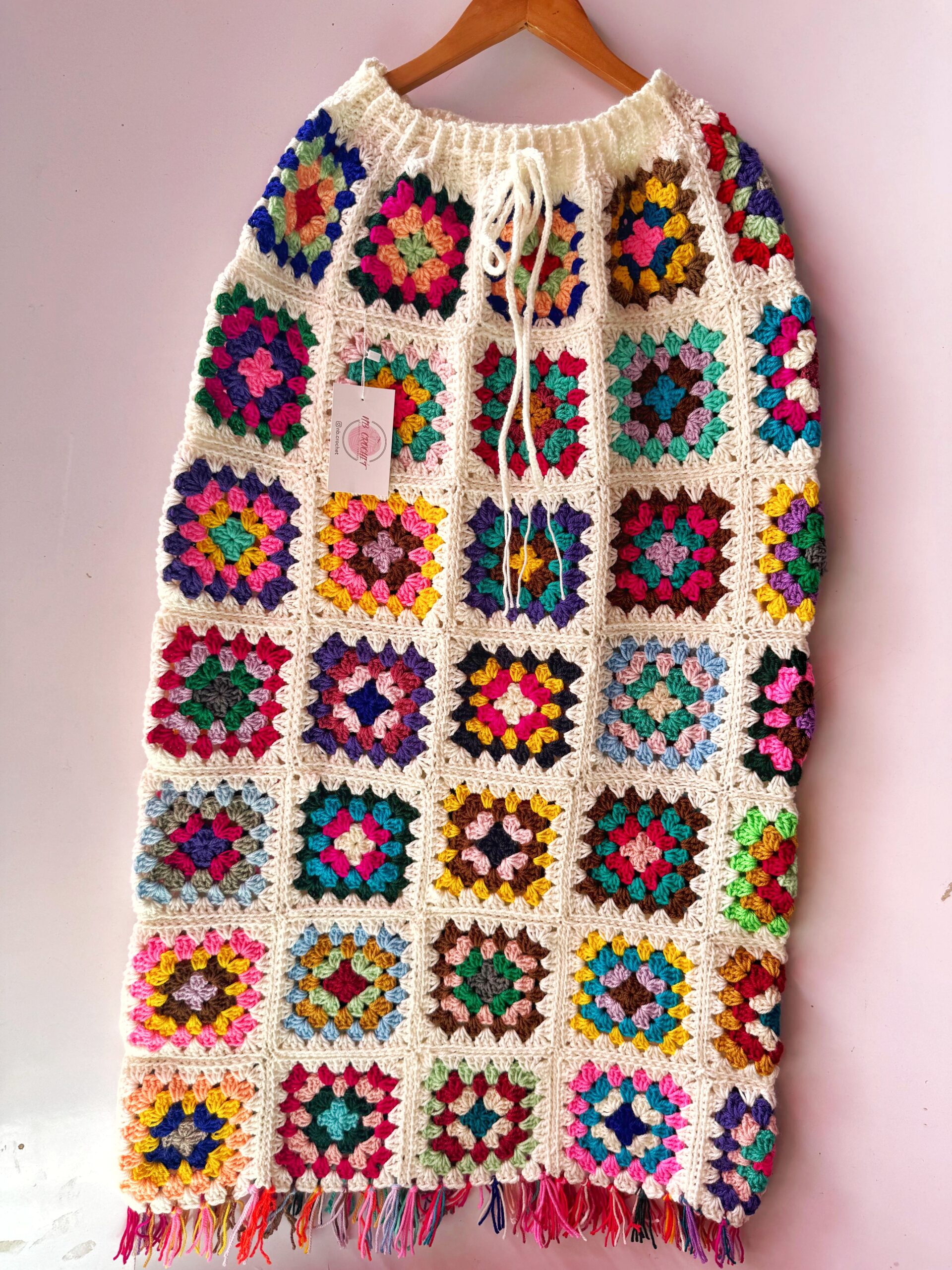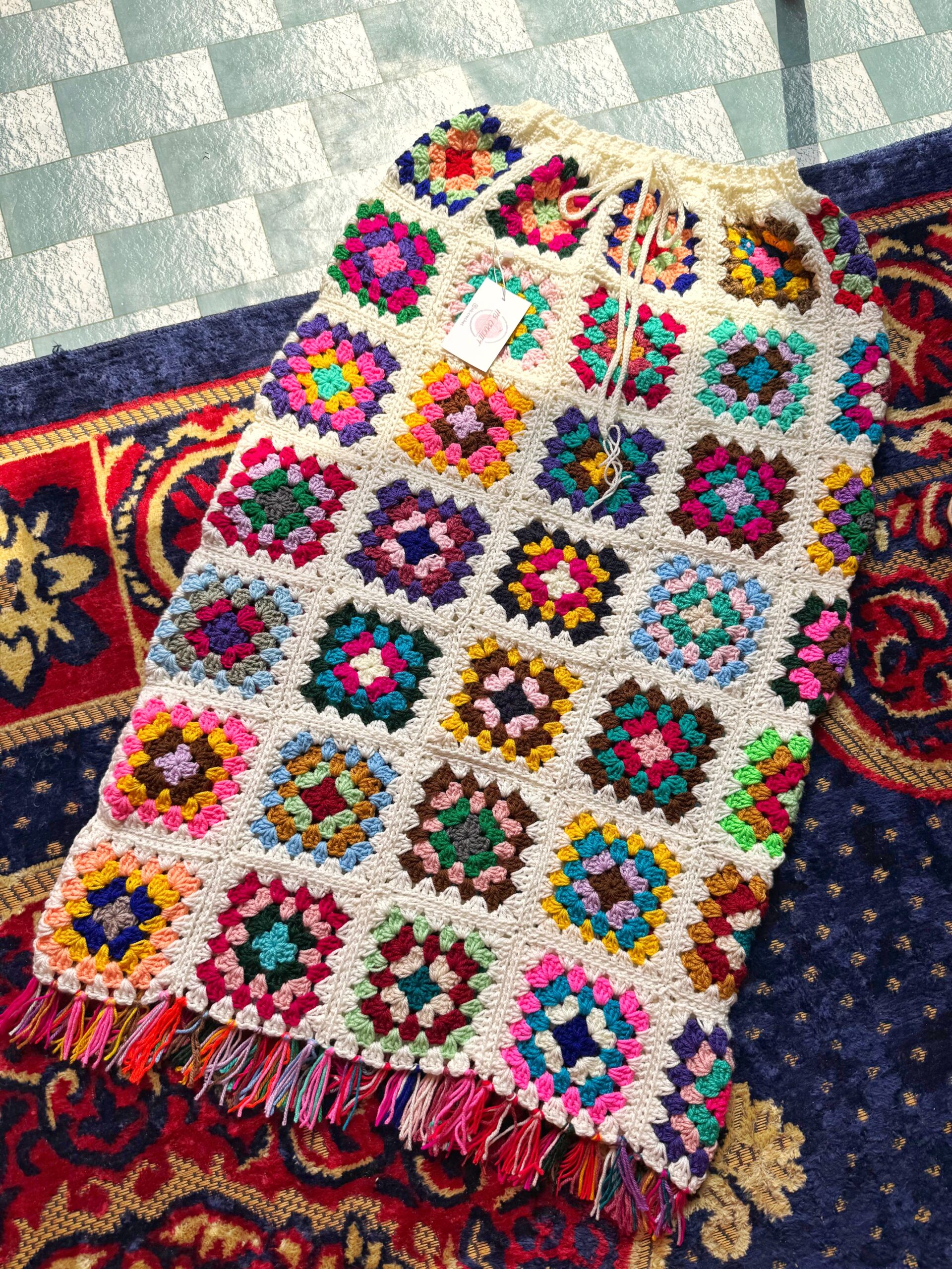🧶 Description: Handmade with vibrant, multicolored granny squares and a cozy cream border.