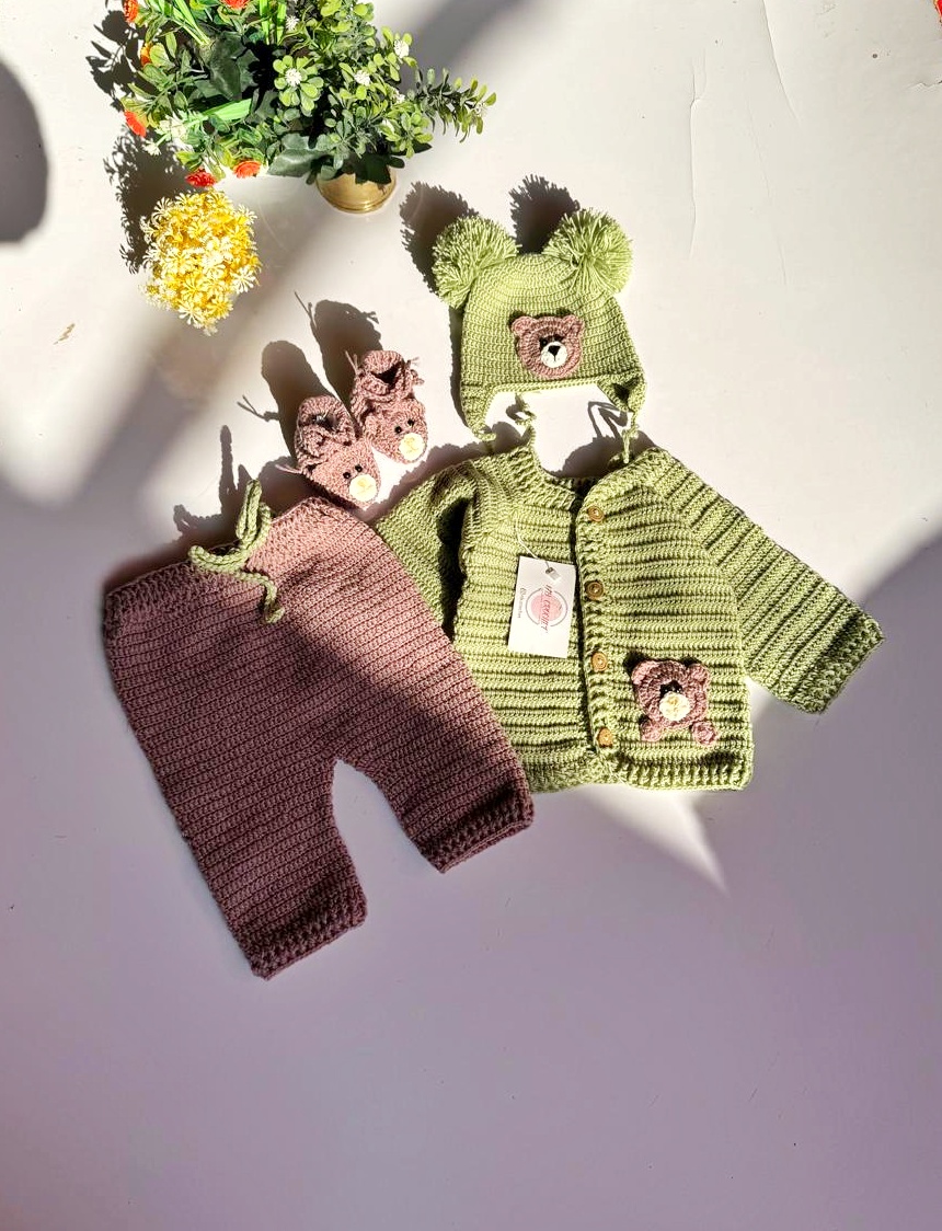 Featuring a soft green cardigan with cute teddy bear details, matching bear-ear hat, comfy brown pants, and tiny booties — perfect for chilly days and photo moments.